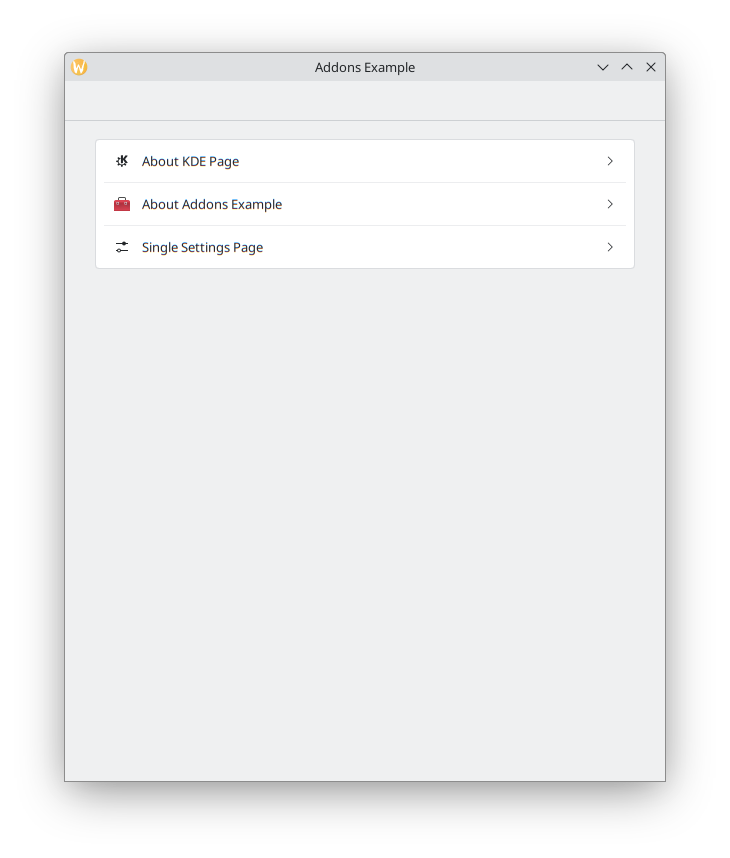 Het idee voor onze app is het ontwerpen van onze eigen Kirigami add-ons galerij, die meerdere componenten etaleert, één per pagina. De hoofdpagina zal een eenvoudige lijst met knoppen bevatten in een ColumnLayout, elk een aparte pagina openend.
